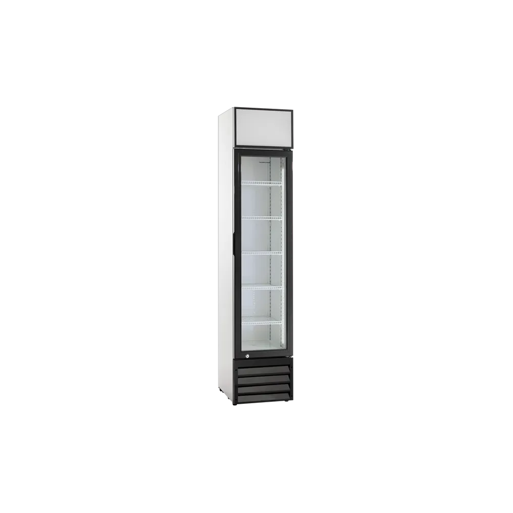 Stilfuld displaykøler i enkelt design. Hvid udenpå samt sort selvlukkende låge. Dit Design i toppen af køleskabet. Energiklasse D. Bemærk: 1 års reklamationsret. Prisen er ekskl. Print