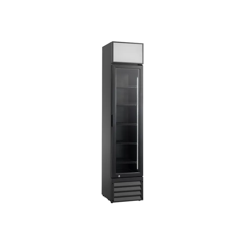SD 217 er en stilfuld displaykøler på 160 liter. Selvlukkende glasdør med lås, 5 Justerbare trådhyler, 2 vertikale LED lys i front samt lystop med LED og ventileret køling. Prisen er ekskl. Print