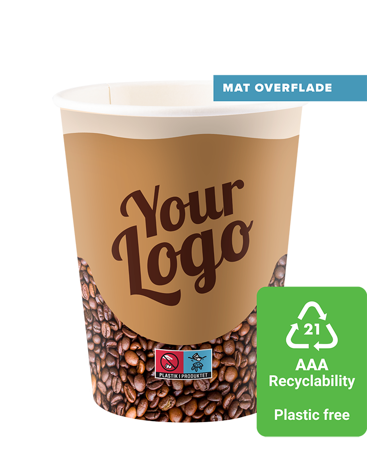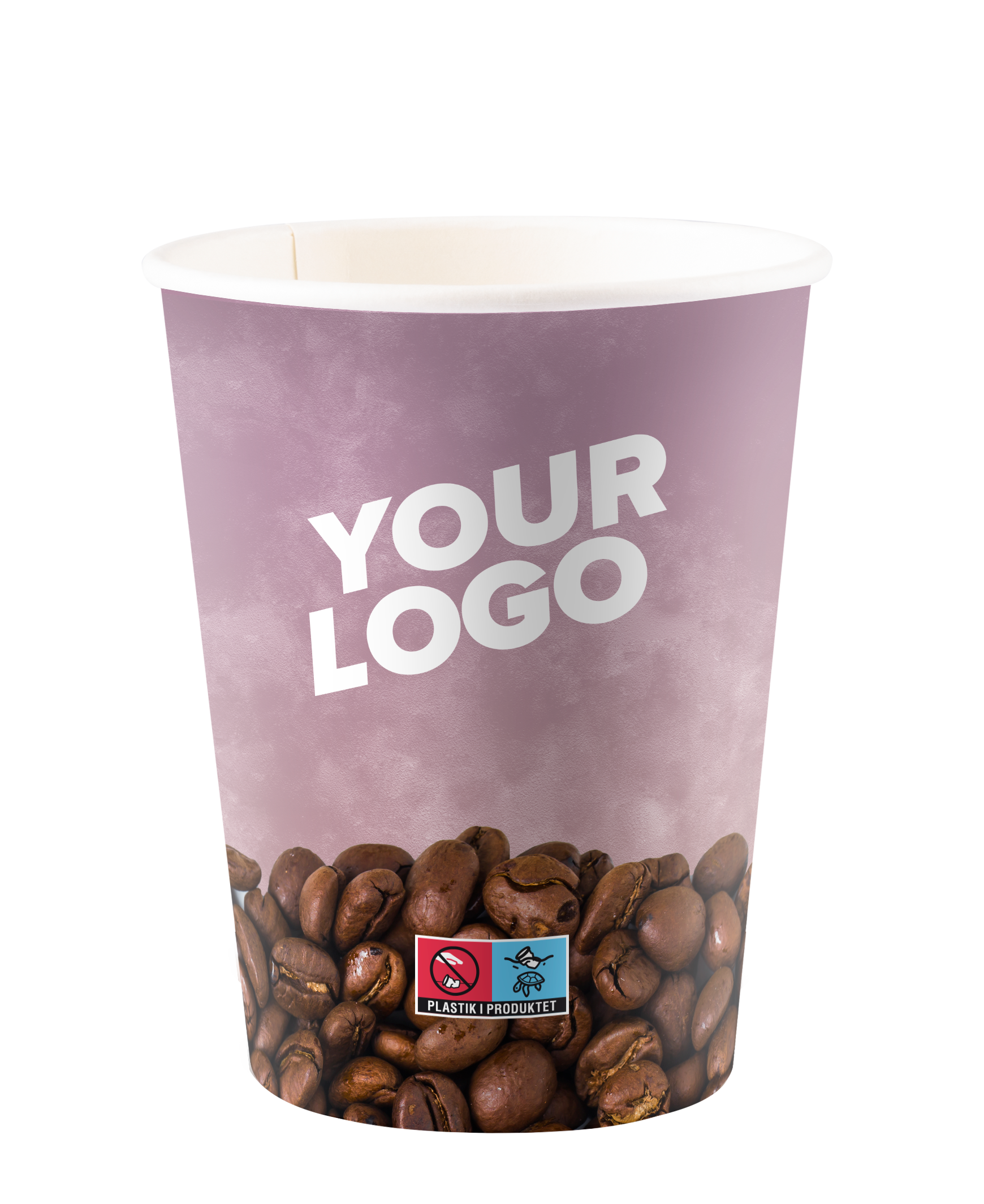 Bionedbrydelige papkrus med bio-mærke påtrykt, som tydeliggøre dette for dine kunder. Papkrus med mat overflade med mulighed for dit logo på hele kruset. Trykket er fuldkommende duft- og smagsfrit. Godkendt til både varme og kolde drikke. Grundet lovkrav, mærkes "Plastik i produktet" logo på koppen (SUPD), uanset plastindhold