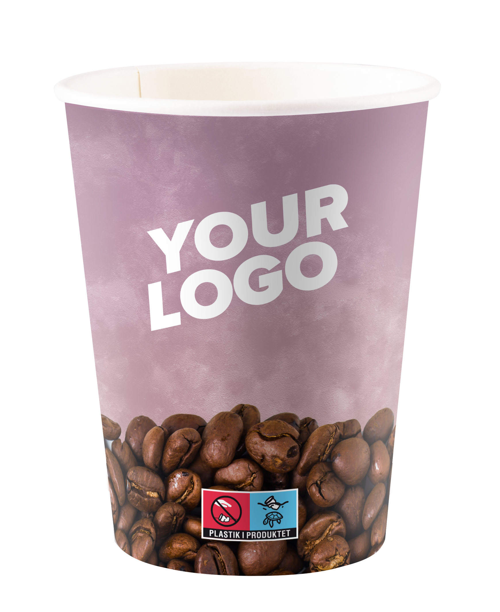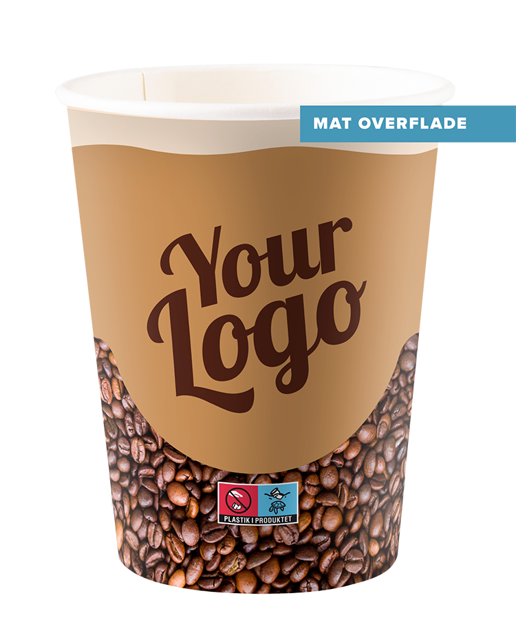 Papkrus med mat overflade med mulighed for dit logo på hele kruset. Trykket er fuldkommende duft- og smagsfrit. Godkendt til både varme og kolde drikke. Grundet lovkrav, mærkes "Plastik i produktet" logo på koppen (SUPD), uanset plastindhold