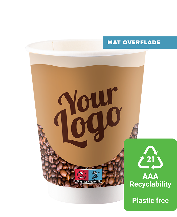 Bionedbrydelige papkrus med bio-mærke påtrykt, som tydeliggøre dette for dine kunder. Papkrus med mat overflade med mulighed for dit logo på hele kruset. Trykket er fuldkommende duft- og smagsfrit. Godkendt til både varme og kolde drikke. Grundet lovkrav, mærkes "Plastik i produktet" logo på koppen (SUPD), uanset plastindhold