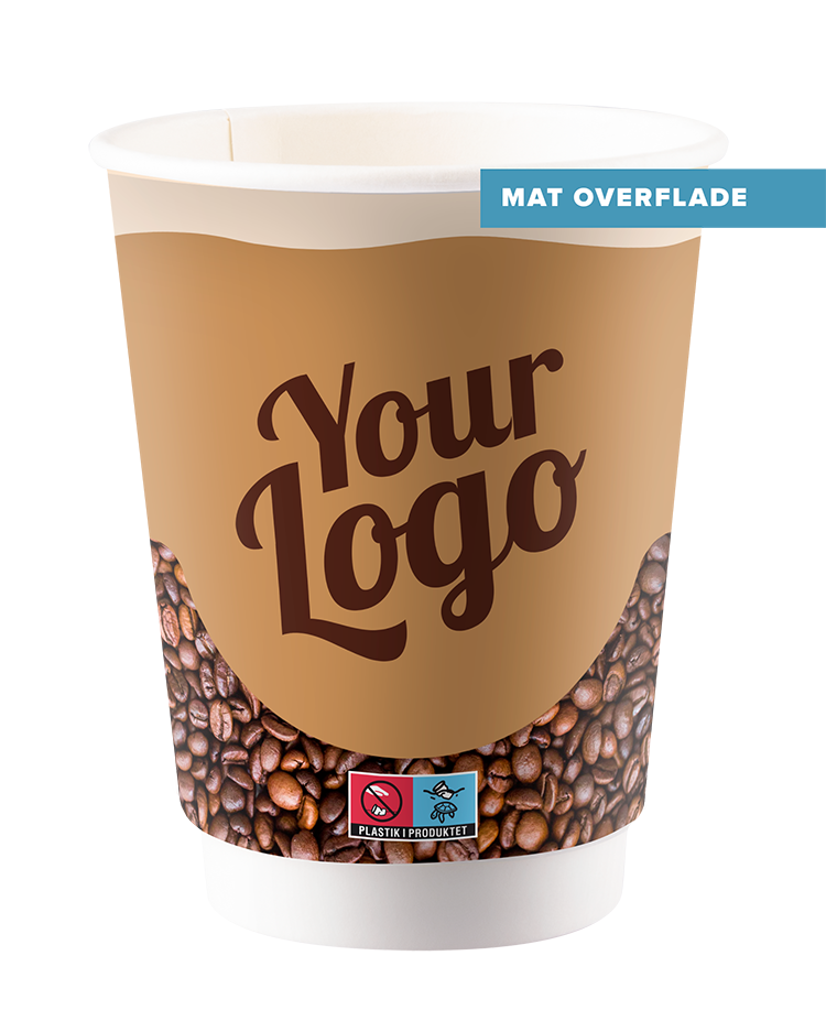 Papkrus med mat overflade med mulighed for dit logo på hele kruset. Trykket er fuldkommende duft- og smagsfrit. Godkendt til både varme og kolde drikke. Grundet lovkrav, mærkes "Plastik i produktet" logo på koppen (SUPD), uanset plastindhold
