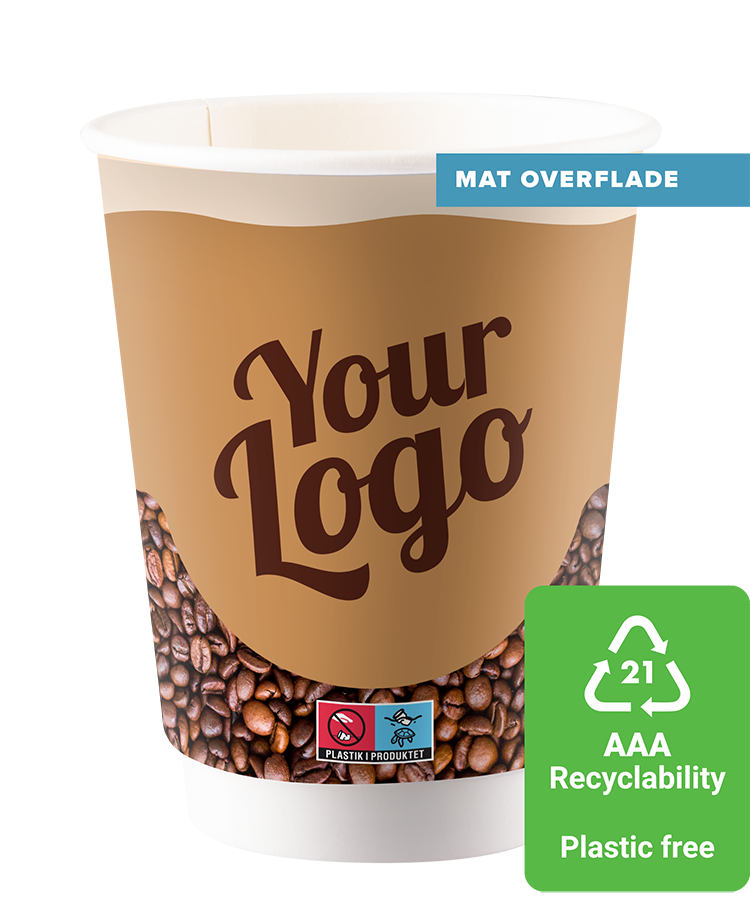 Bionedbrydelige papkrus med bio-mærke påtrykt, som tydeliggøre dette for dine kunder. Papkrus med mat overflade med mulighed for dit logo på hele kruset. Trykket er fuldkommende duft- og smagsfrit. Godkendt til både varme og kolde drikke. Grundet lovkrav, mærkes "Plastik i produktet" logo på koppen (SUPD), uanset plastindhold