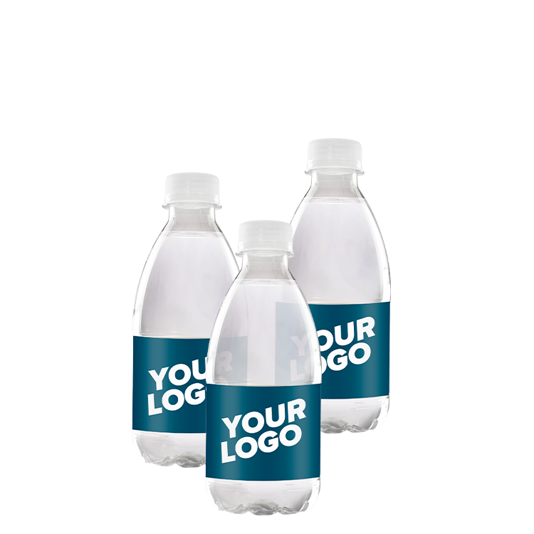 Logovand i flot 0.33 flasker, fås med både sort og klar låg. Flasken er produceret af 50% genanvendt plast. Etiketten måler 196x48 mm. Pakkes med 12 stk. pr Kolli