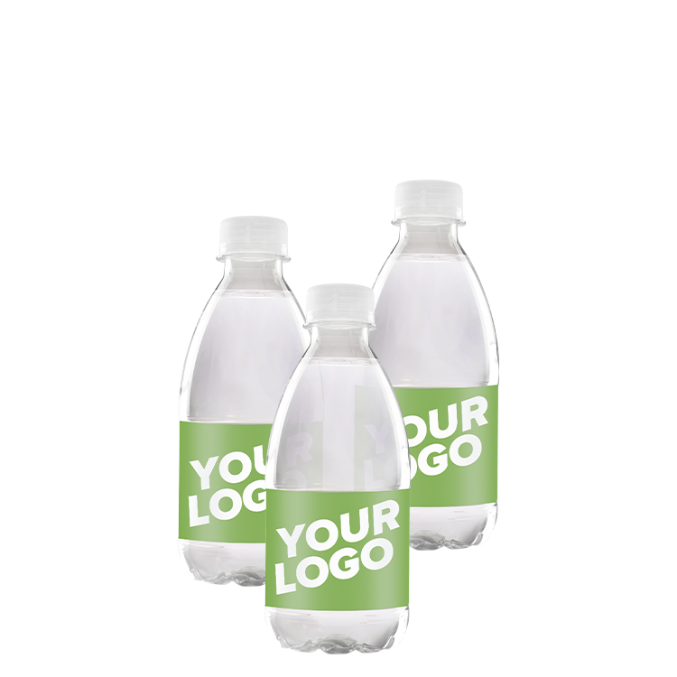 Logovand i flot 0.33 flasker, fås med både sort og klar låg. Flasken er produceret af 50% genanvendt plast. Etiketten måler 196x48 mm. Pakkes med 12 stk. pr Kolli